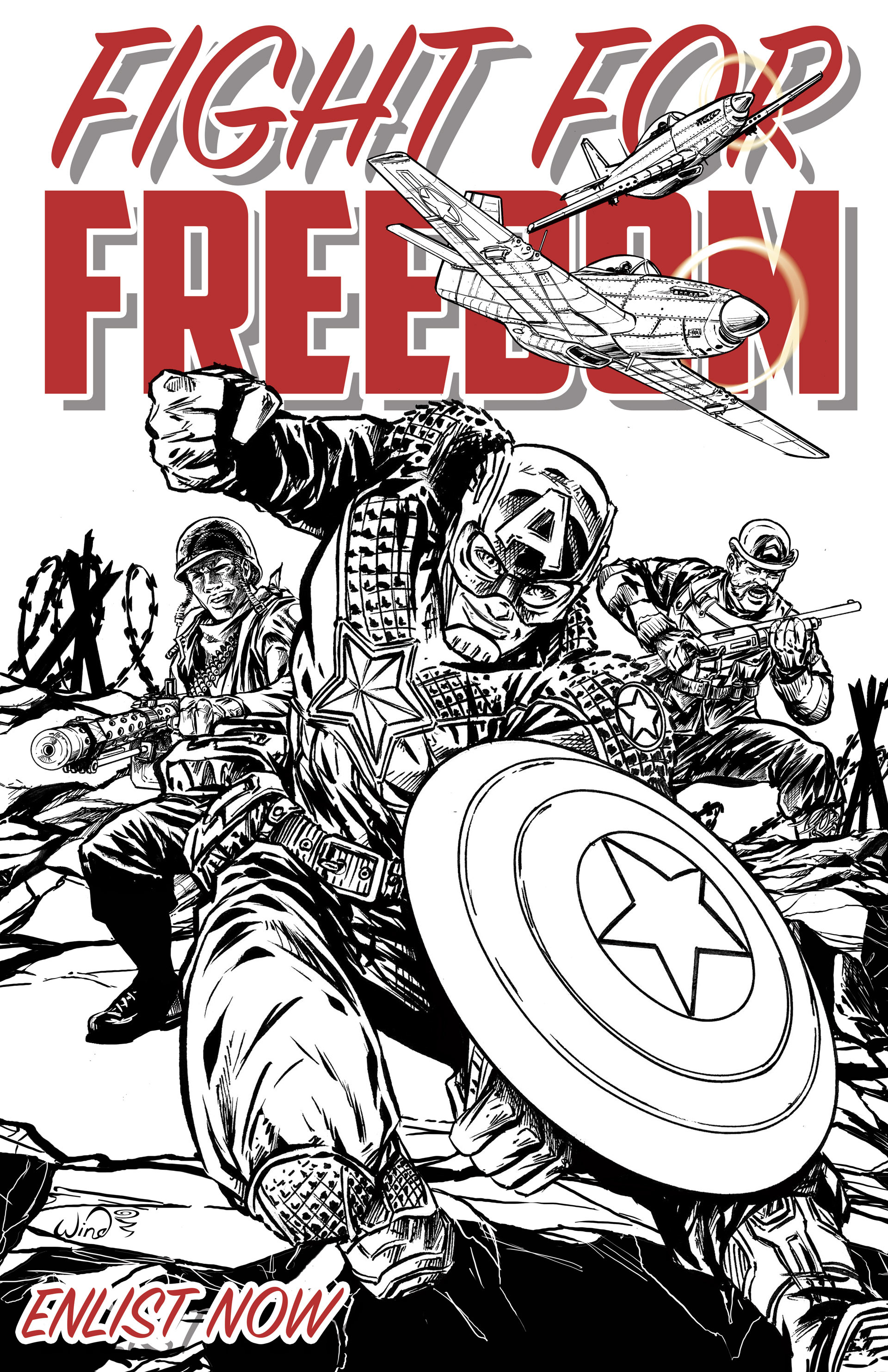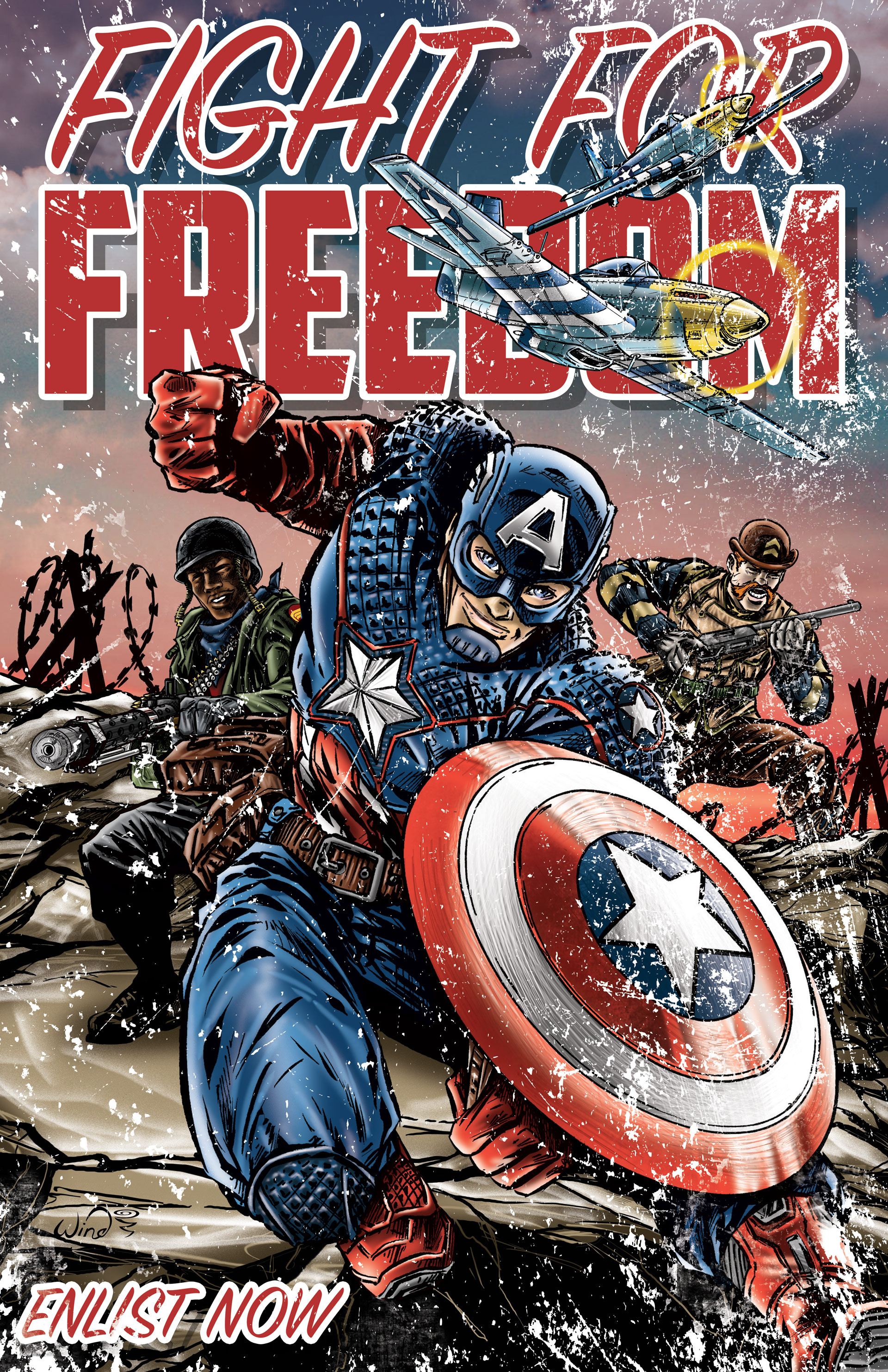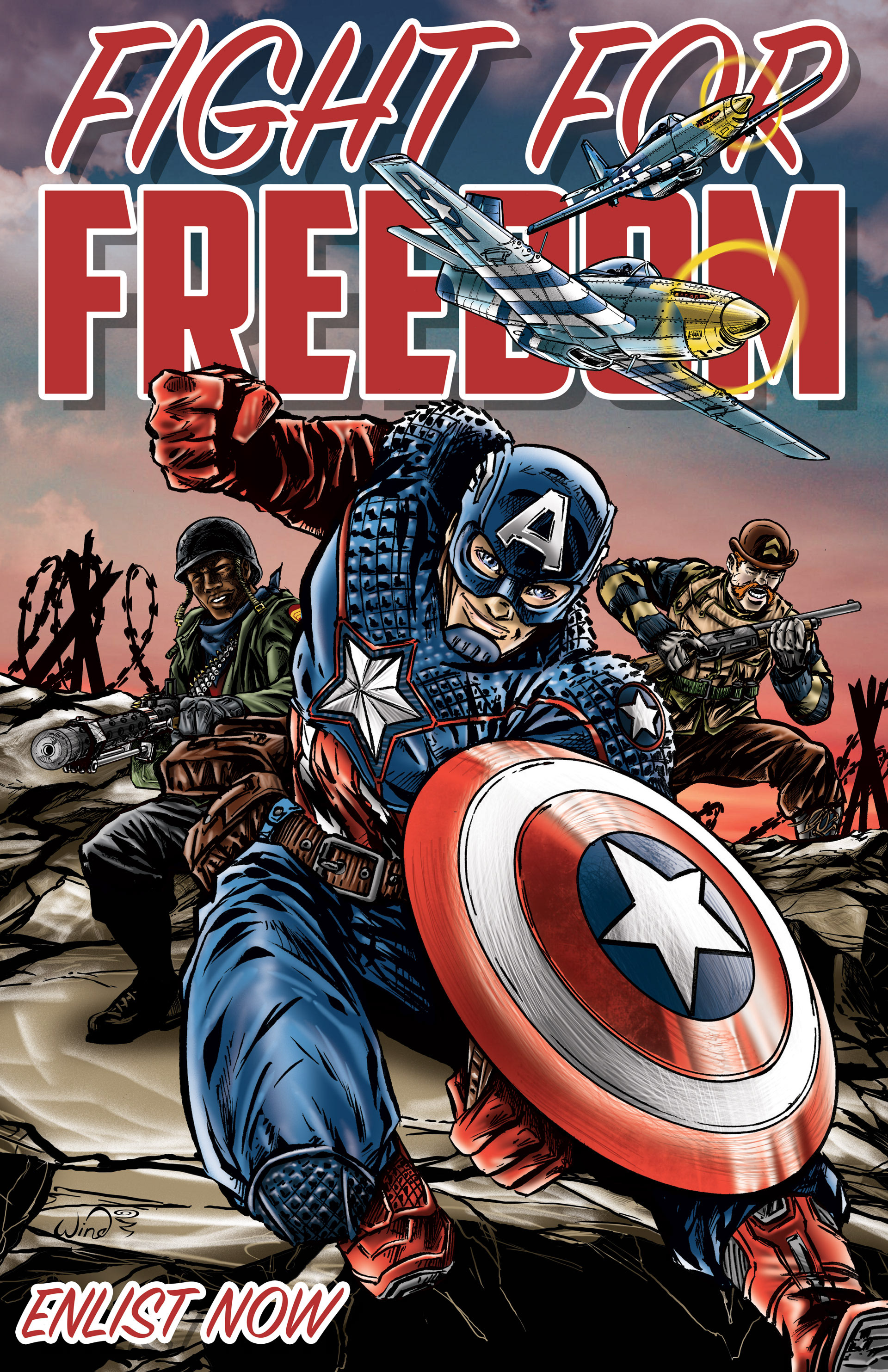 Who's here to save the American way? The Star Spangled Man with the plan! Captain America! He's been one of my heroes since I was a kid. I remember the joy and heartbreak of having a sweet Captain America utility belt as a kid and finding out my dog chewed it up. I also had the original Secret Wars toy that's now very battle damaged from tons of adventures. This poster came about when one of my own boys wanted a poster for their room. And Cap needs some Howling Commandos. And hey - why not add some P-51s while we're at it? Why not make it a sweet vintage World War 2 recruitment poster too? Why not?