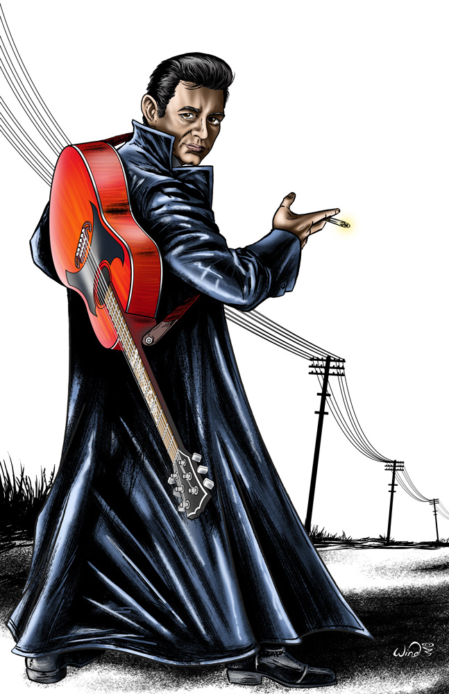 I remember hearing Johnny Cash tunes for the first time. He’s the Man in Black, who’s been everywhere and then fell into a burning ring of fire. Who wouldn’t like all that? Great music. Great story. In this piece I sought to combine the younger Cash with the older era of Cash from ‘the Legend of Johnny Cash’ album where he’s walking on a lonely country road. Red Guitar. Fun to draw.