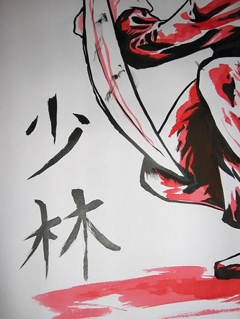 I created these four scroll paintings as well as worked on a wall mural to help decorate the School of Shaolin, a Kung Fu school north of Minneapolis. I tried to focus on the main styles this school of traditional Chinese Kung Fu emphasizes as well as give a feel for their ideals. Specifically they focus on Northern Shaolin and Seven Star Mantis Styles but also have some Tiger and Crane styles as part of their training as well as tumbling, wrestling and traditional weapon forms. Each scroll painting features one of these styles: Northern Shaolin, Mantis, Crane and Tiger styles. The wall mural on the other hand depicts three scenes meant to symbolize a student coming to train (center image), the skills they have yet to achieve (left) and the skill they achieve after training (right). The same symbolism is a part of the training as well as students strive for things yet to come and things they have mastered. I used watercolors for the scroll paintings and fashioned the materials to make them. I used acrylics on the wall murals and aimed to keep them more monochromatic to offset the dynamic color of the watercolors.
